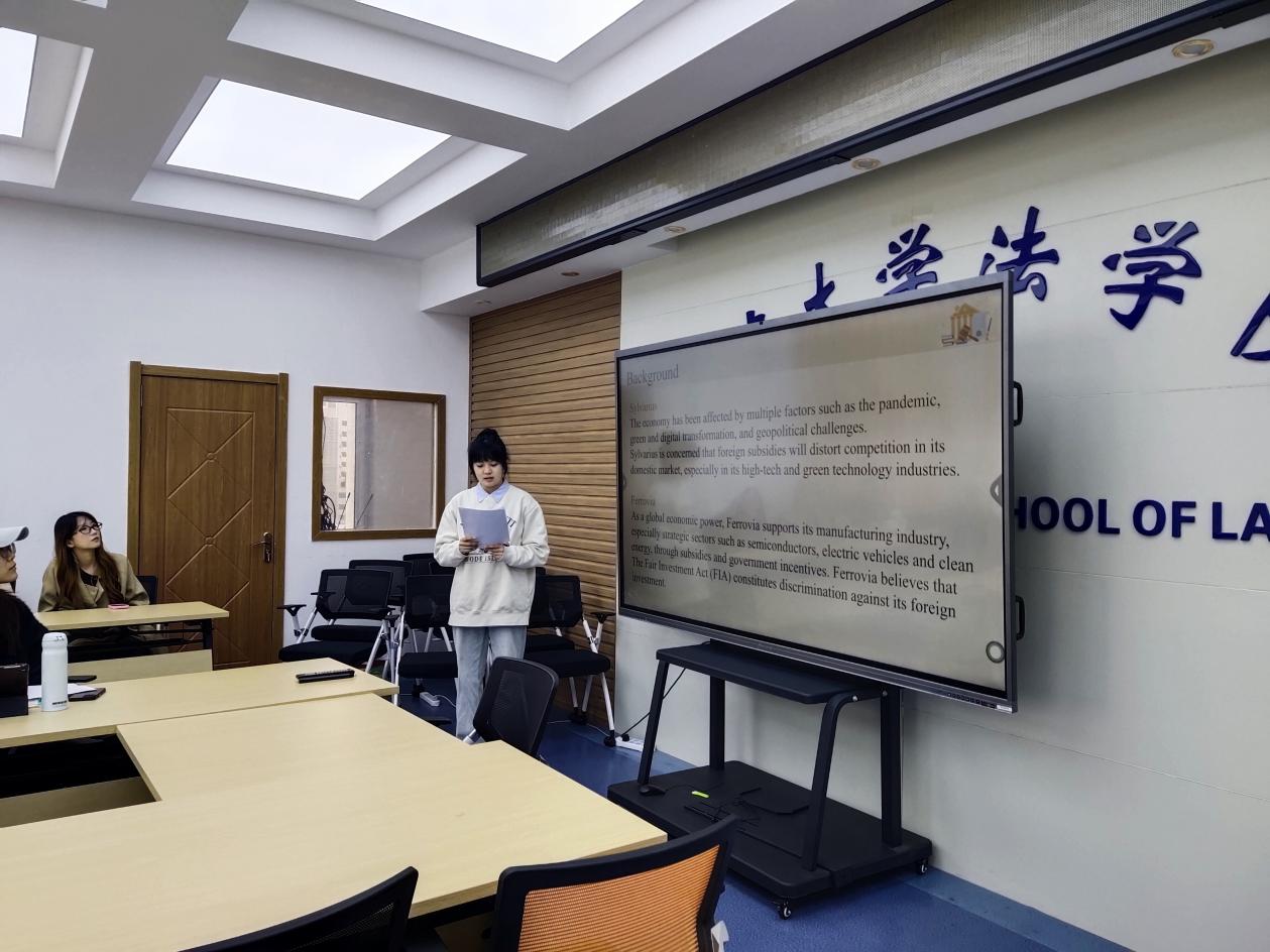 本次活动中,来自不同年级的参会同学依次上台发表展示,围绕 WTO赛题,从案件事实梳理、法律条文适用、争议焦点分析、辩论思路构建等方面进行了阐述。