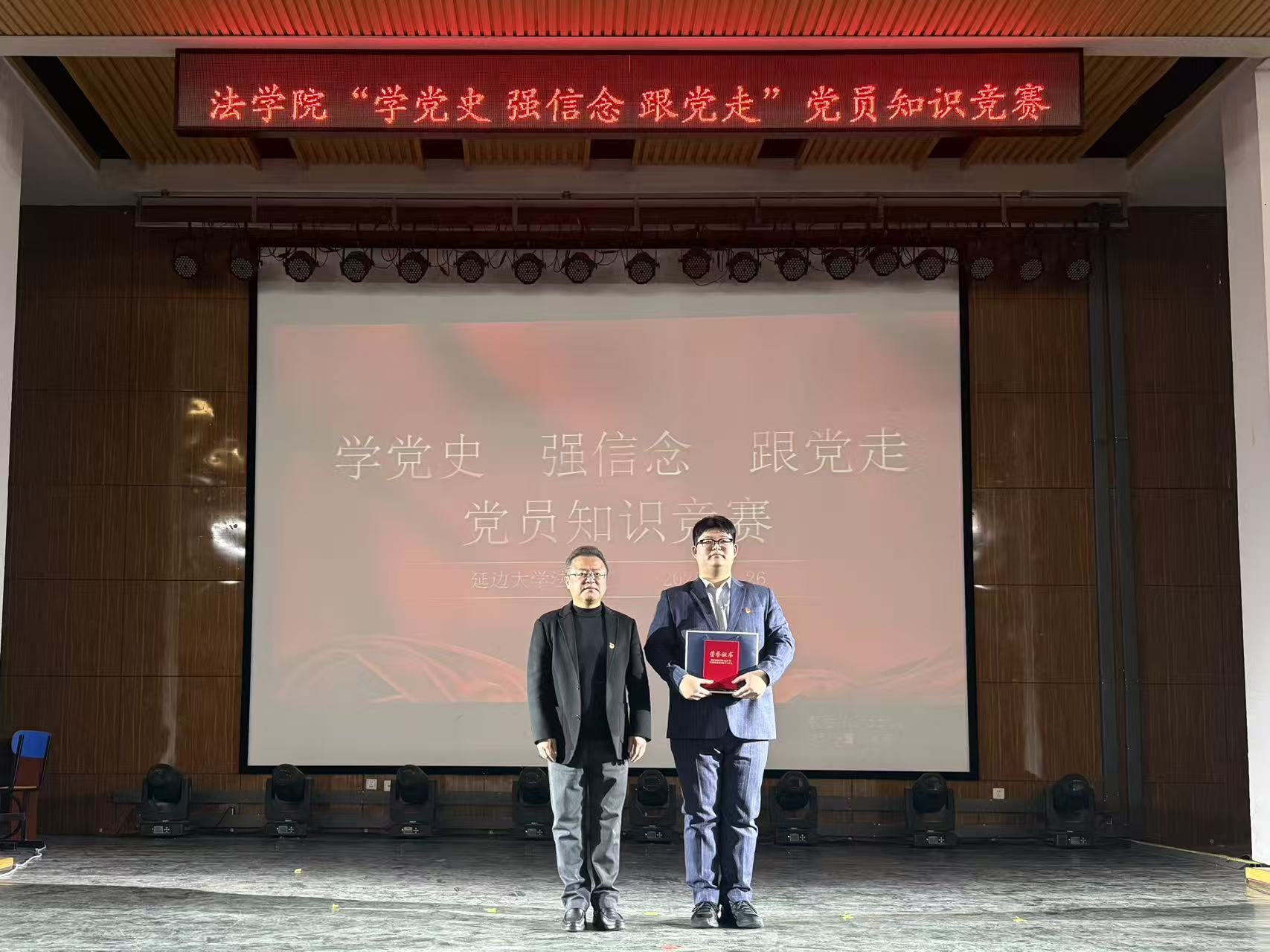 2025年11月26日,延边大学法学院“学党史 强信念 跟党走”党员知识竞赛在丹青楼学术报告厅成功举办。本次活动由延边大学法学院党委主办,旨在深化党史学习教育,锤炼党员党性修养,营造“以赛促学、以学促行”的浓厚氛围。法学院党委副书记赵光、延边大学党委组织员金玉丹出席活动,学院全体党员和入党积极分子参加。