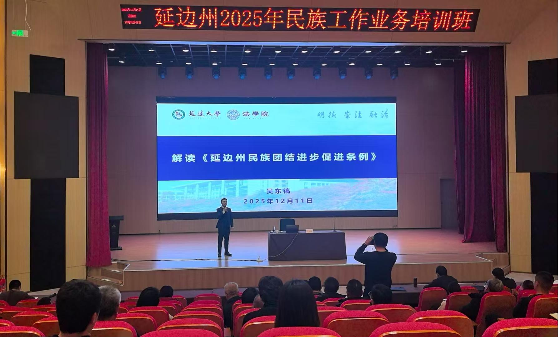 为深入学习贯彻党的二十届四中全会精神及习近平总书记关于加强和改进民族工作的重要思想,扎实推进民族团结进步事业高质量发展,2025年12月9日至12日,延边朝鲜族自治州民族事务委员会在图们市图们江学苑举办“延边州2025年民族工作业务培训班”。12月11日下午,延边大学法学院院长吴东镐教授应邀为培训班作题为“解读《延边州民族团结进步促进条例》”的专题讲座,全州各族各界民族工作领域百余名学员参加学习。