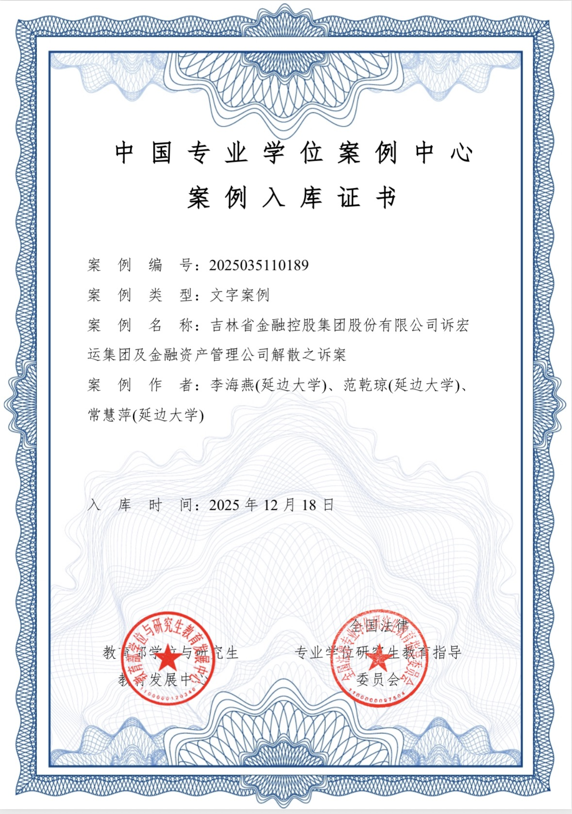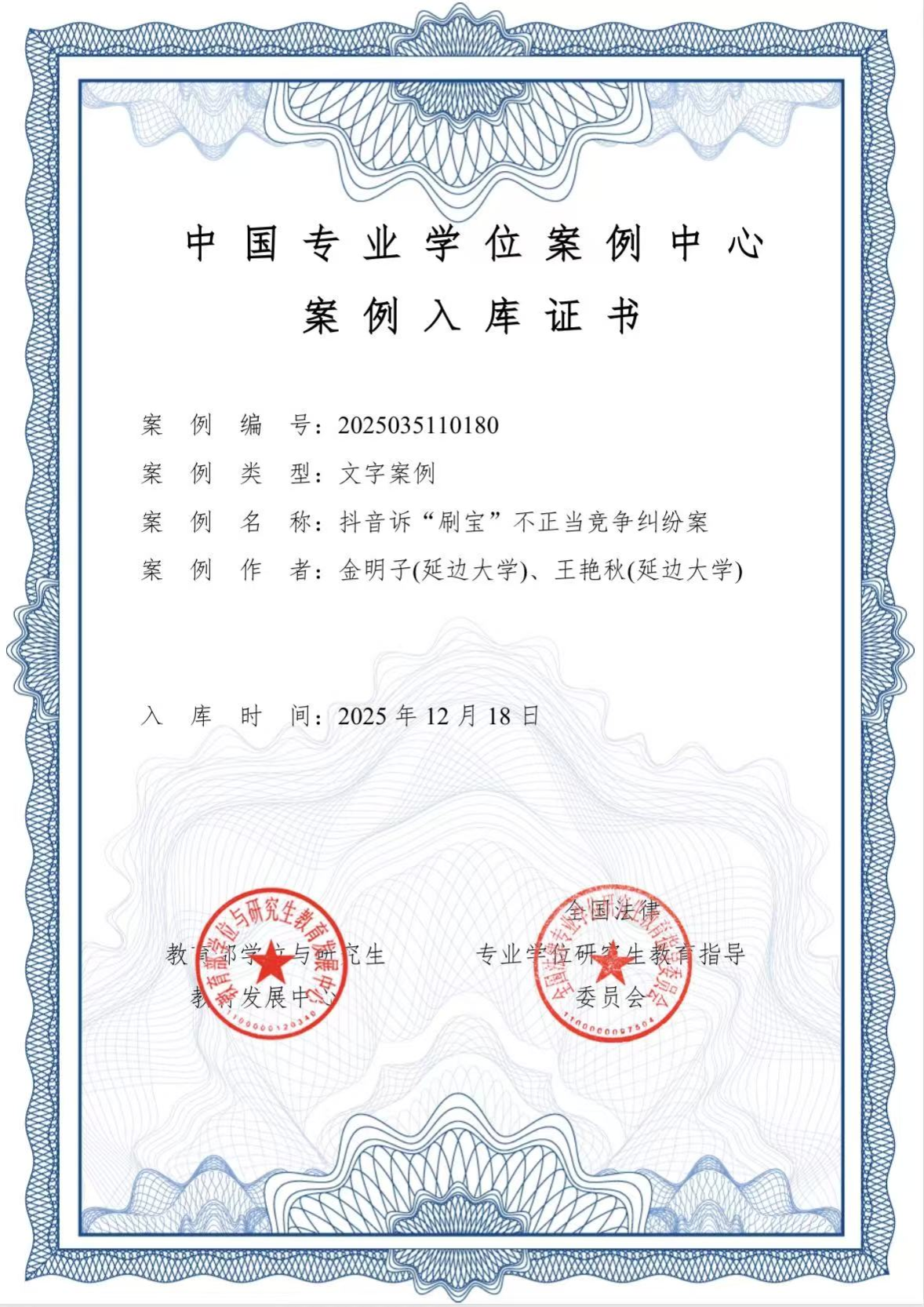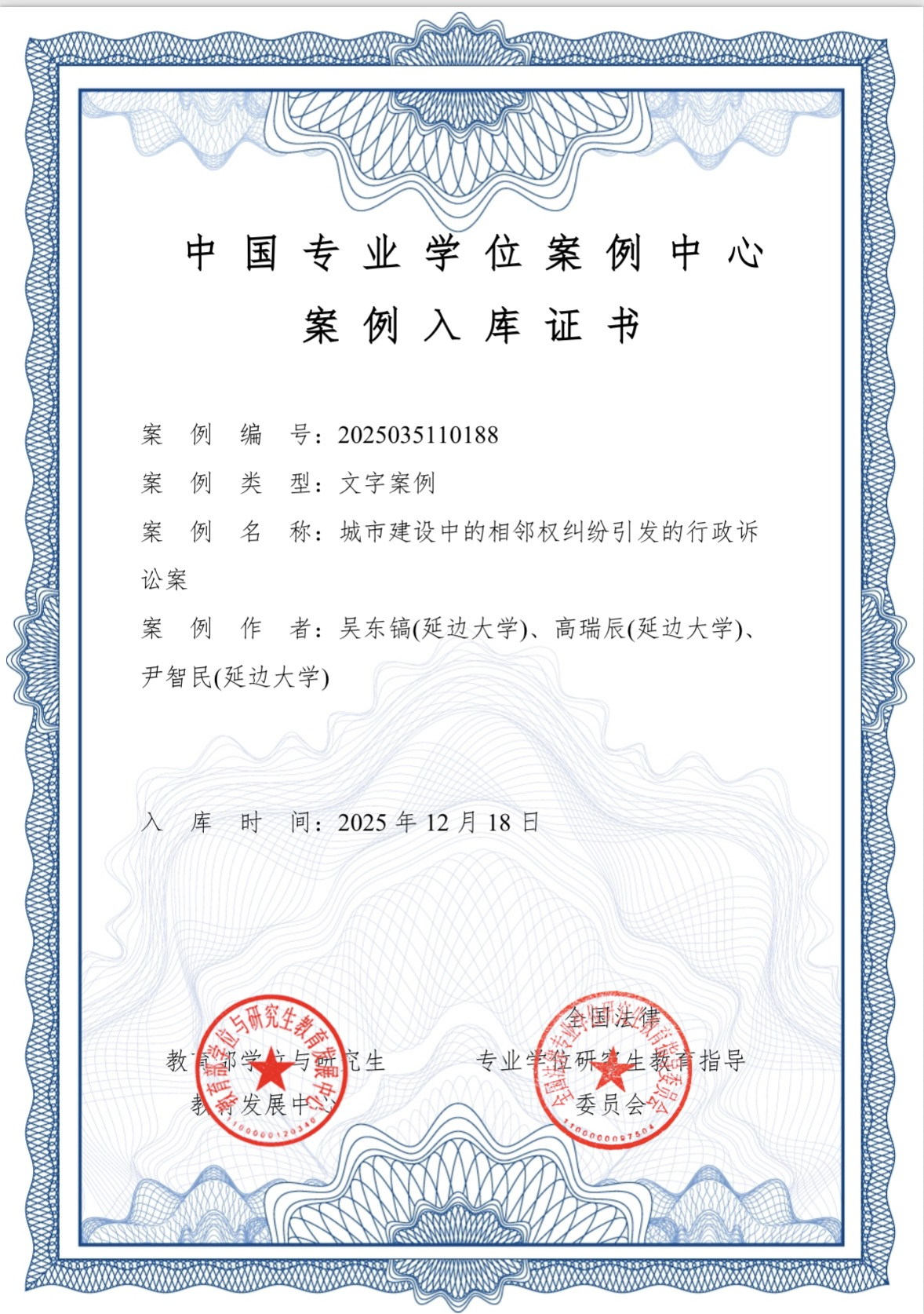 近日,全国法律专业学位研究生教育指导委员会公布了第五批法律硕士专业学位文字教学案例评审结果,其中由延边大学法学院吴东镐教授团队(吴东镐、高瑞辰、尹智民)撰写的《城市建设中的相邻权纠纷引发的行政诉讼案》;李海燕教授团队(李海燕、范乾琼、常慧萍)撰写的《吉林省金融控股集团股份有限公司诉宏运集团及金融资产管理公司解散之诉案》;韩昌善、金燕老师团队(韩昌善、金燕、李红广、李丽英)撰写的《宜宾丰源盐业有限公司延边分公司诉吉林省敦化市盐务管理局行政强制案》;金明子老师团队(金明子、王艳秋)撰写的《抖音诉“刷宝”不正当竞争纠纷案》等四篇案例凭借深厚的法律专业积淀与精准透彻的案例分析,兼具扎实的理论深度与重要的实践指导价值。经初审、复审、会审多轮严格评审,最终脱颖而出,成功入选“中国专业学位案例中心案例库”。
