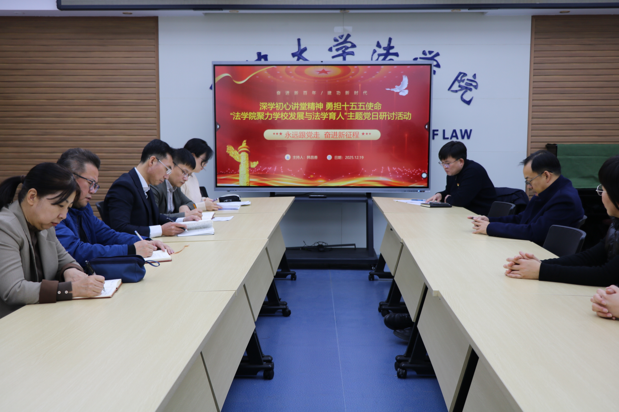 12月19日下午,为深入学习贯彻校党委书记杜锐同志“初心党员讲堂(第一讲)”核心讲话精神,"紧扣'强国建设,延大何为''东北振兴,延大何为'时代命题",切实将学习成果转化为推动法学教育高质量发展的务实举措,法学院教师党支部召开全体党员大会,专题开展“深学初心讲堂精神 勇担十五五使命 法学院聚力学校发展与法学育人”学习研讨主题党日活动。会议由党支部书记韩昌善同志主持,全体教师党员参会,围绕涉外法治人才培养模式创新、课程体系优化等关键议题展开热烈讨论,形成了育人共识。
