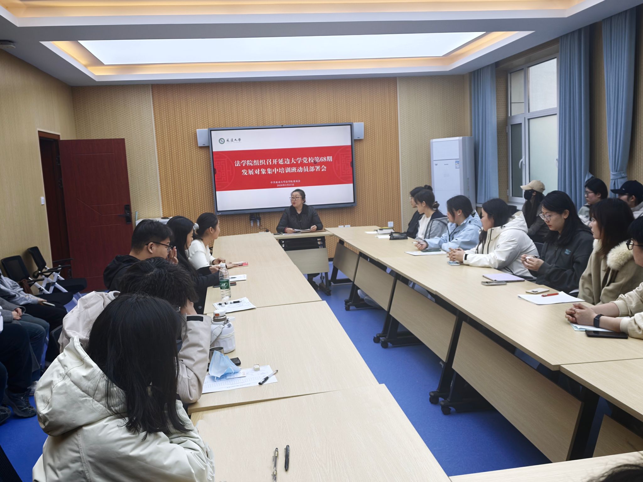 2026年3月27日下午,在法学院112会议室召开延边大学第68期发展对象集中培训动员部署会,会议由法学院党办主任李月红主持,全体参训学员参加。